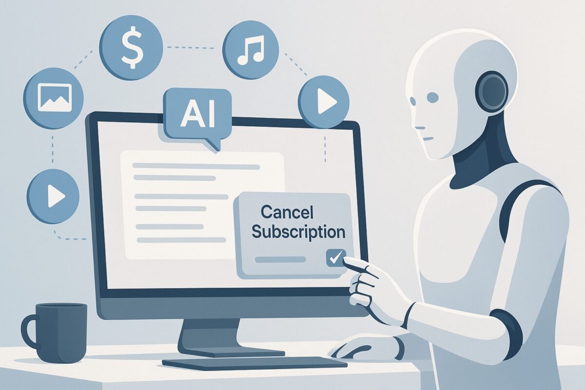 Ilustración de agentes de IA automatizando tareas digitales como cancelar suscripciones y gestionar cuentas online.